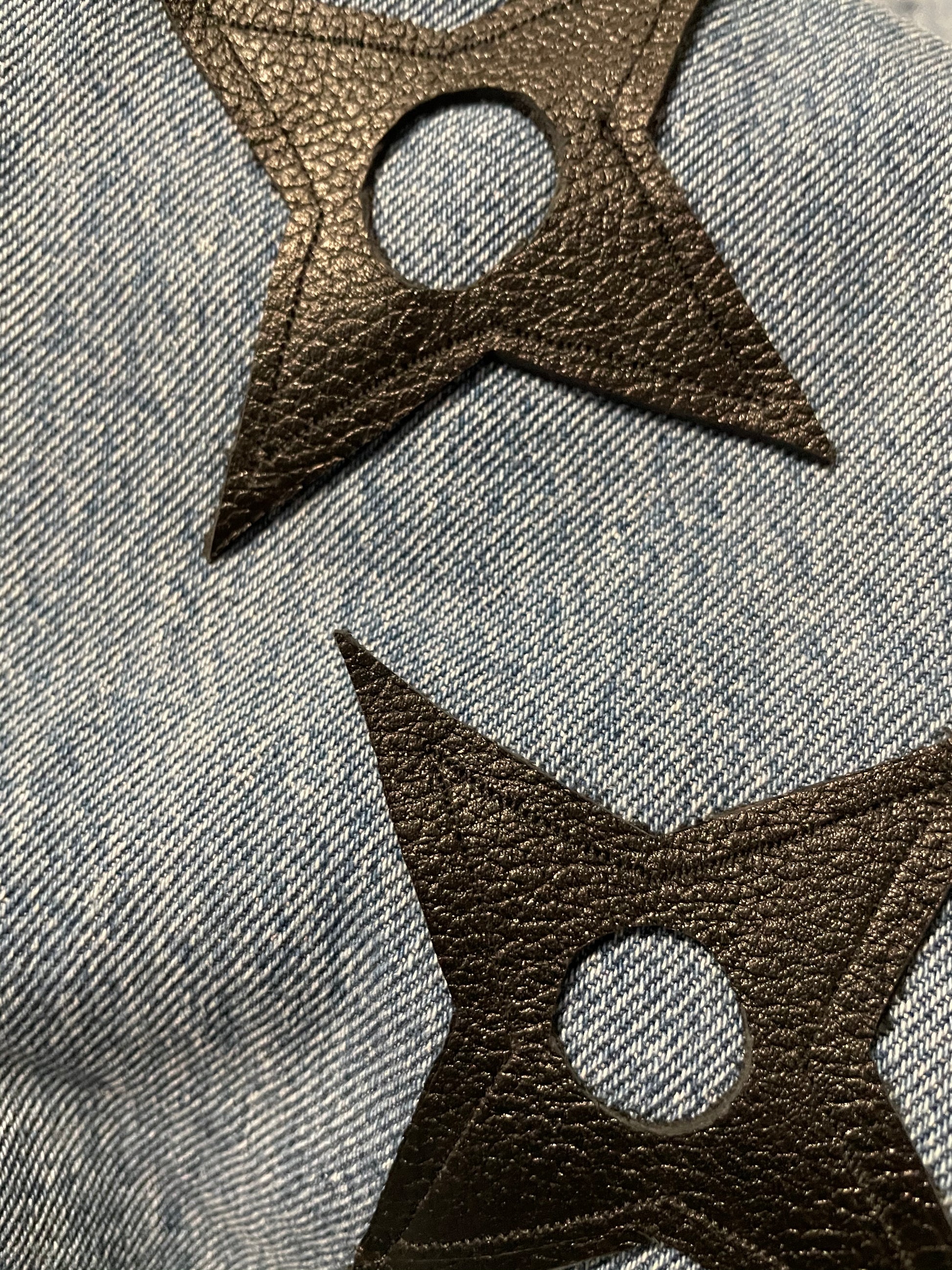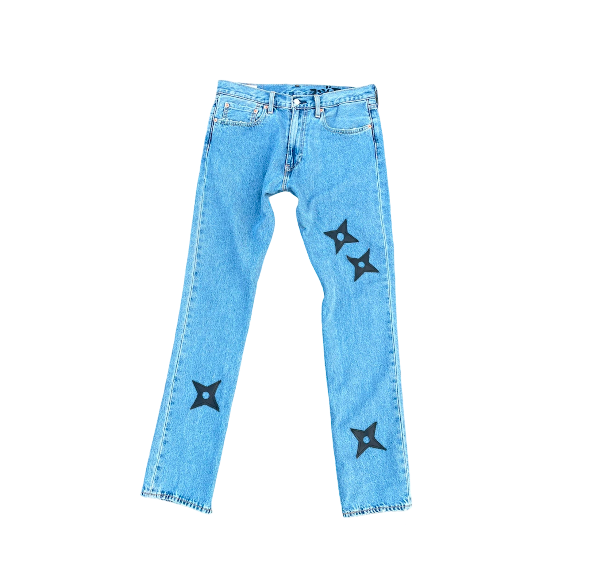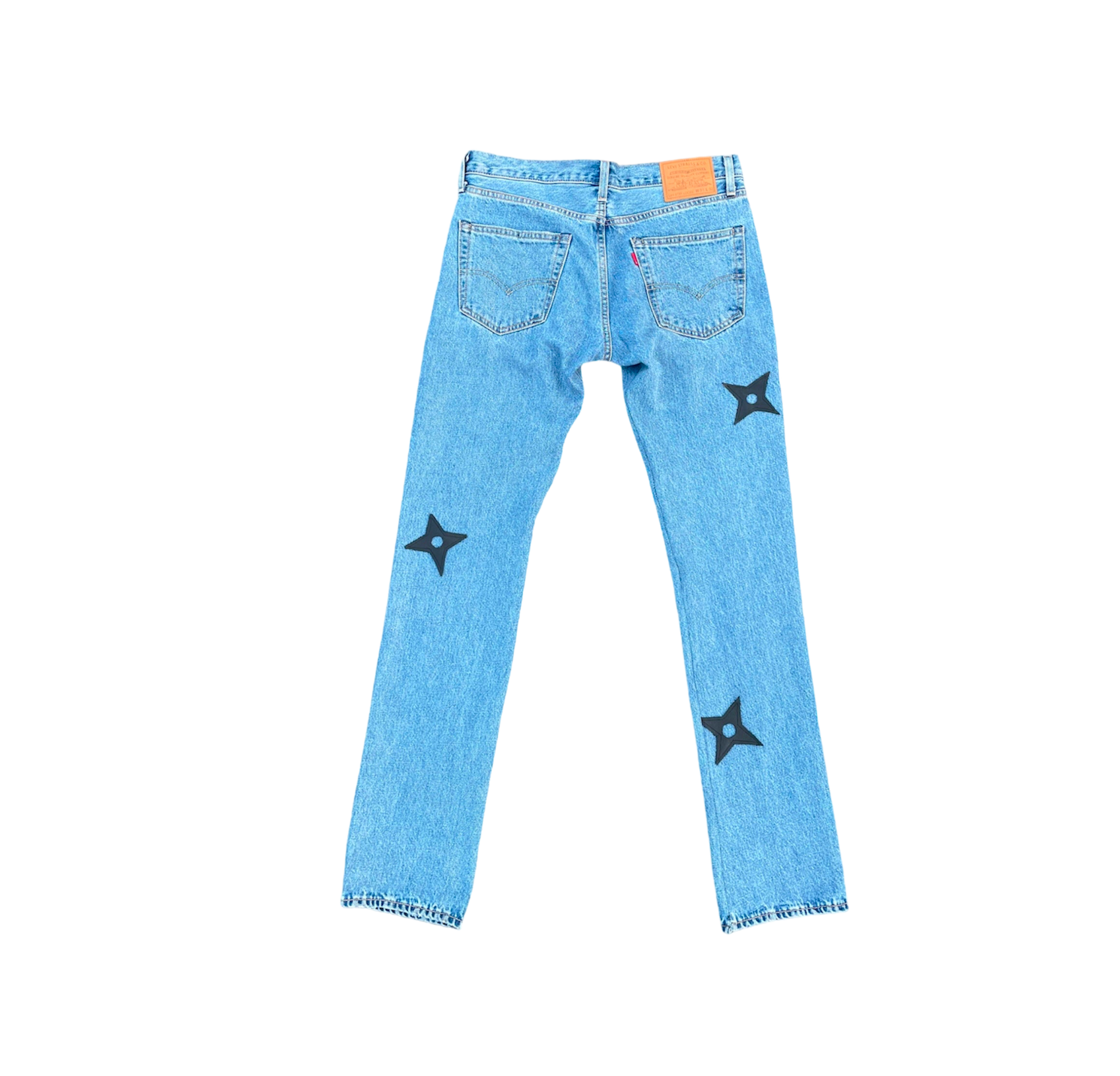Pair of Levi’s vintage Loose denim 501 jeans. Customized and tailored to a slimmer perfect fit with stitched in leather ninjas stars.