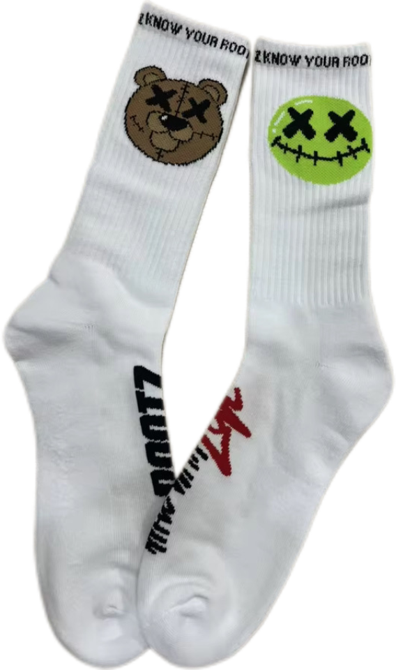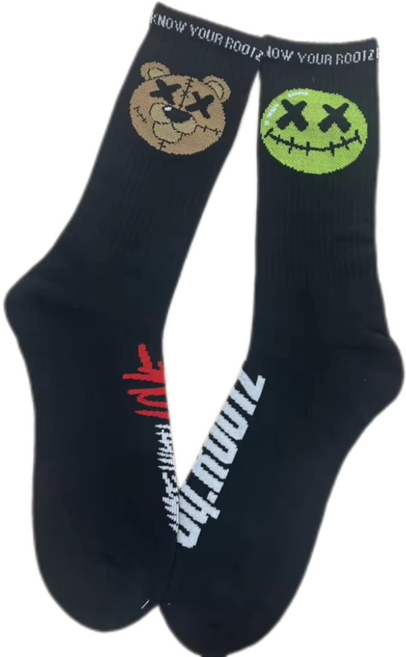 Cotton/Poly high crew sock with Fujimoto Smiley and Sq.Rootz Dead Teddy jacquard graphics.